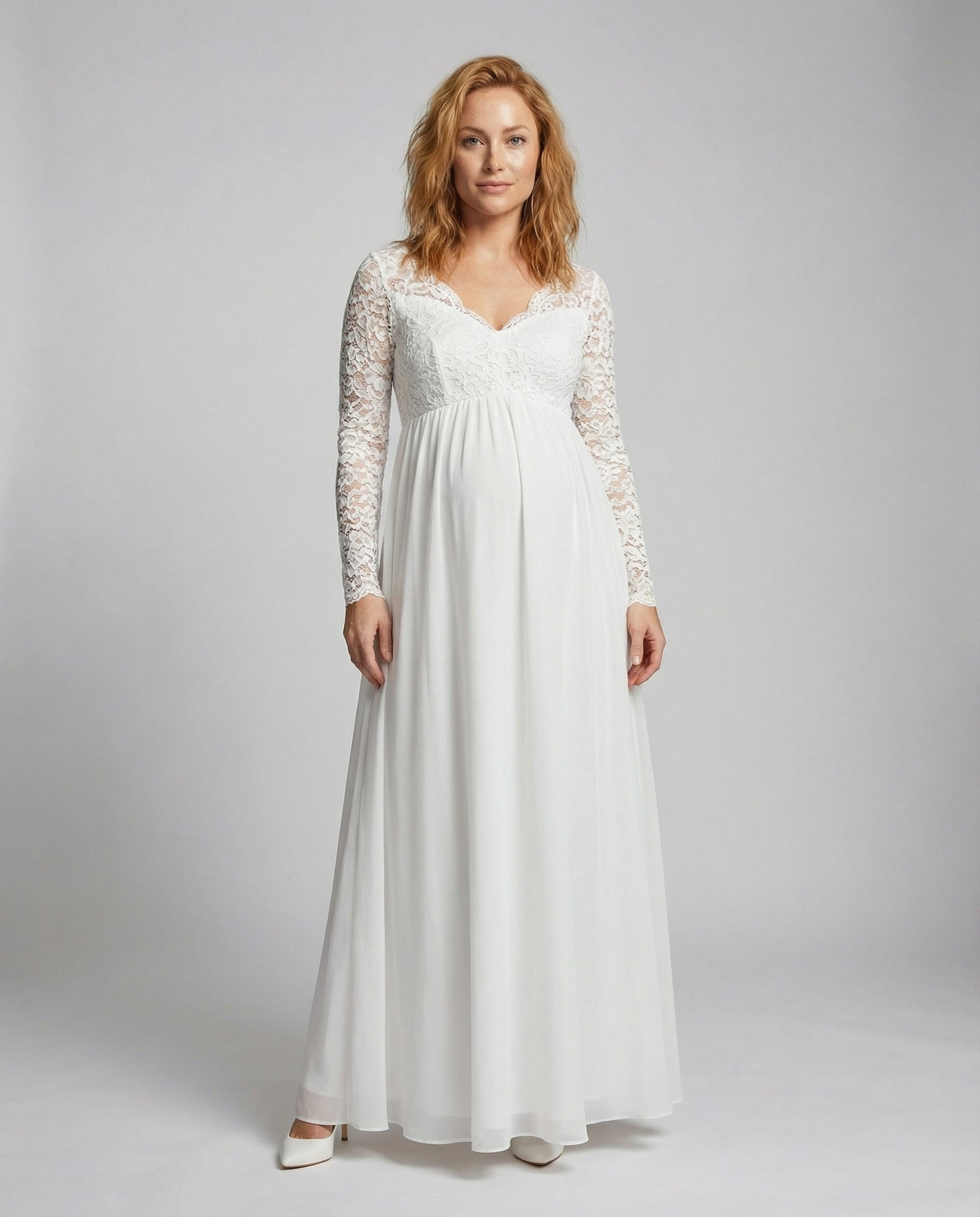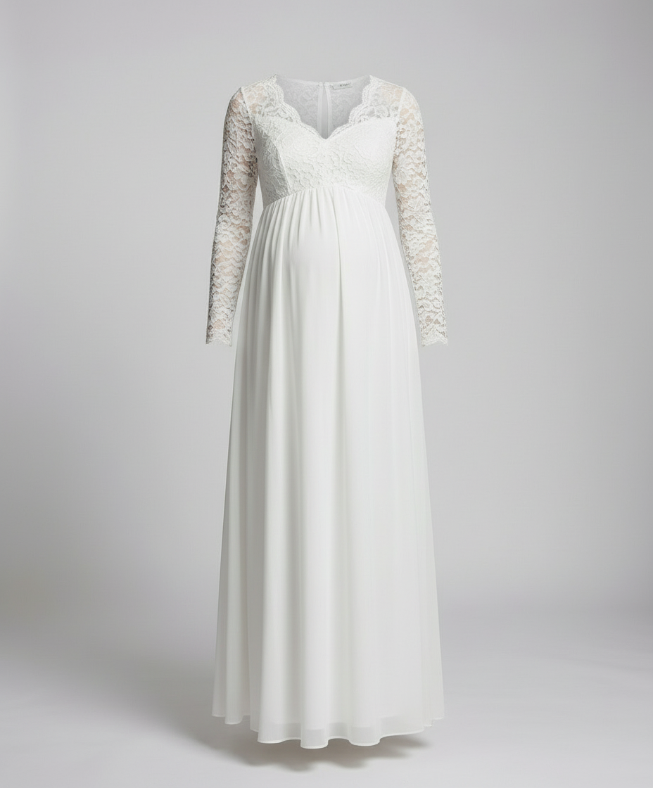 Denna eleganta spetsmaxiklänning för gravida är designad för att kombinera tidlös stil med hög komfort under graviditeten. Den mjukt fallande A-linjesilhuetten ger utrymme för den växande magen samtidigt som den skapar ett harmoniskt och feminint uttryck.