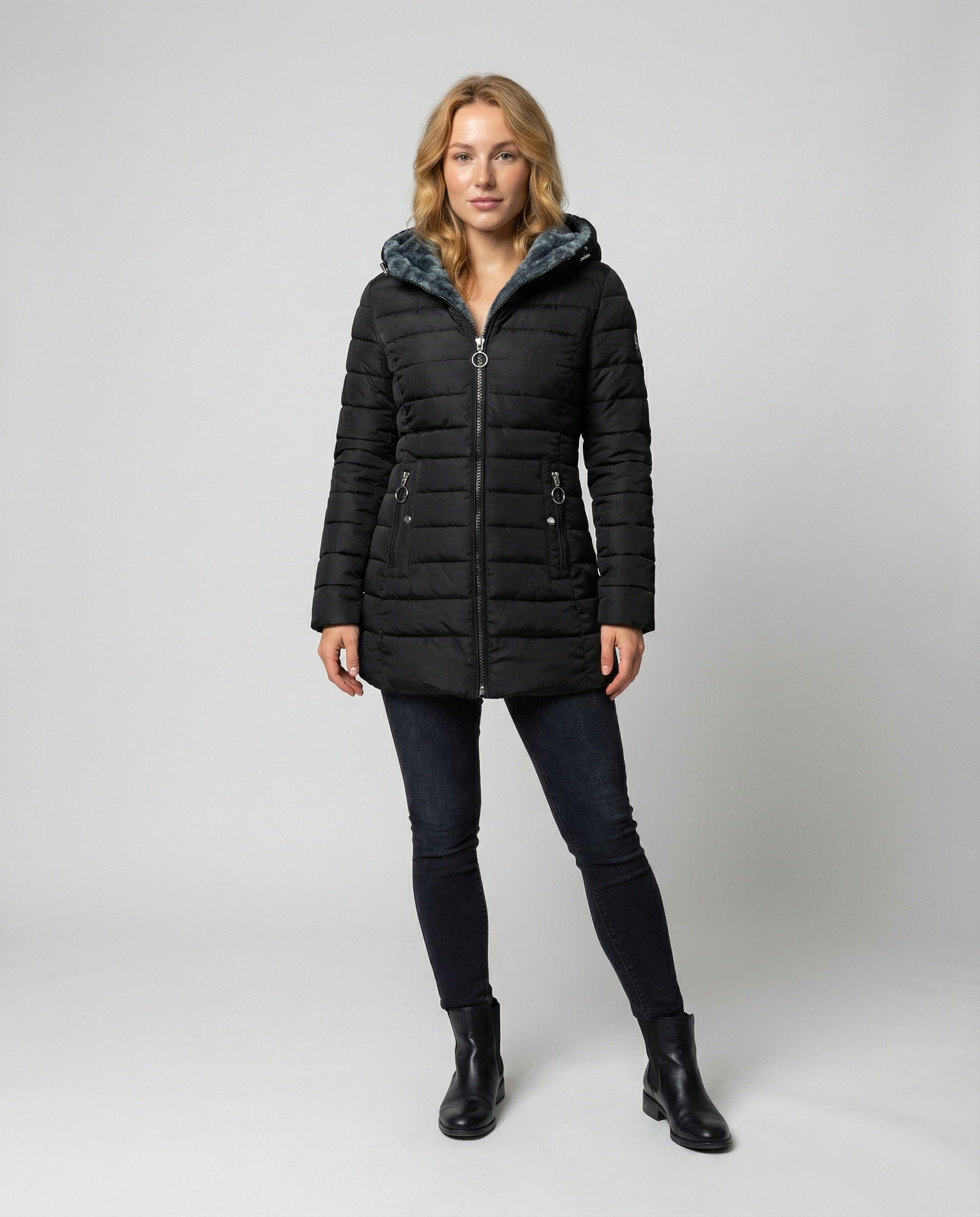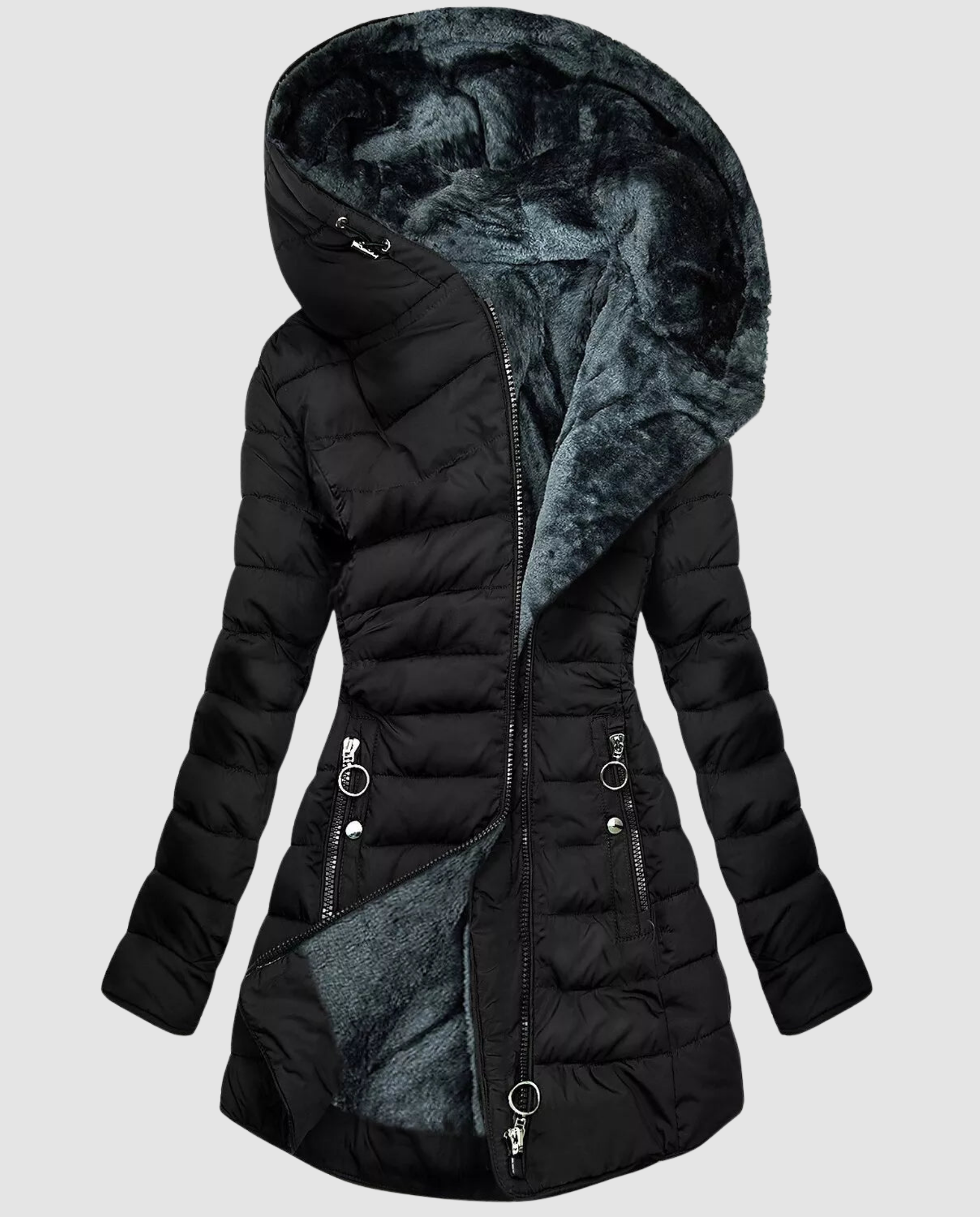 Denna långa vinterjacka för damer är designad för att ge skydd och komfort under kalla dagar. Den förlängda modellen bidrar till ökad värme, medan huvan och den genomgående dragkedjan ger praktisk funktion. Passar för vardag och utomhusbruk.