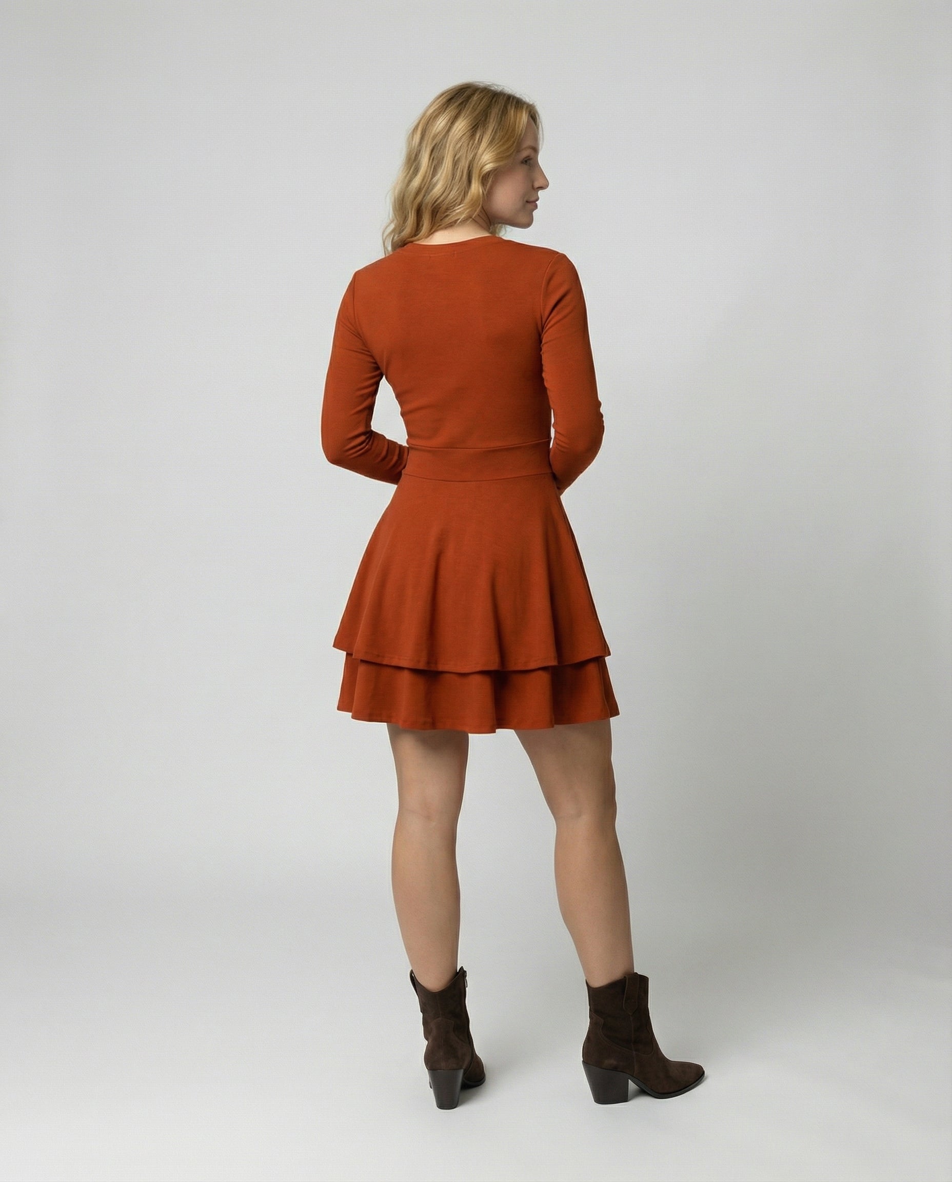Denna vikklänning för damer är utformad för att kombinera elegant stil med hög bärkomfort. V-ringningen och omlottdesignen skapar en smickrande silhuett, medan volangerna i kjolen ger ett mjukt och feminint uttryck. Passar både för vardagliga och mer uppklädda tillfällen.