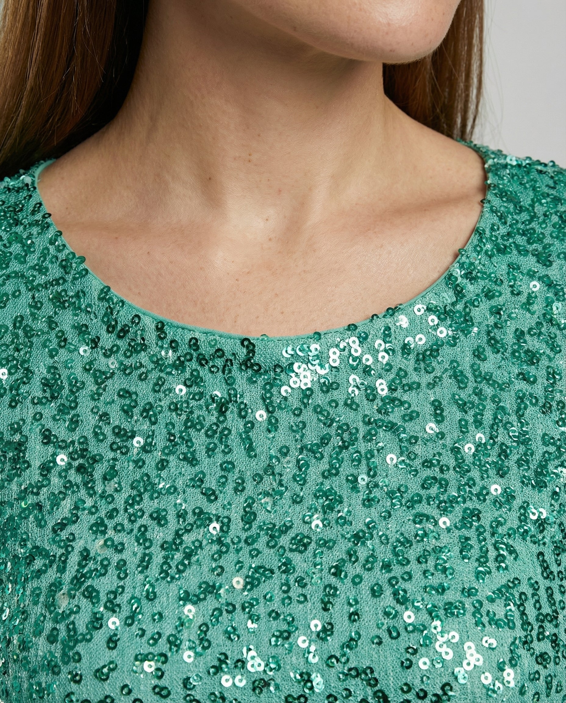 The backless sparkling winter dress for women combines festive elegance with a modern and confident design. The shimmering fabric gives a sophisticated expression, while the open back creates a stylish contrast suitable for winter's special occasions.
